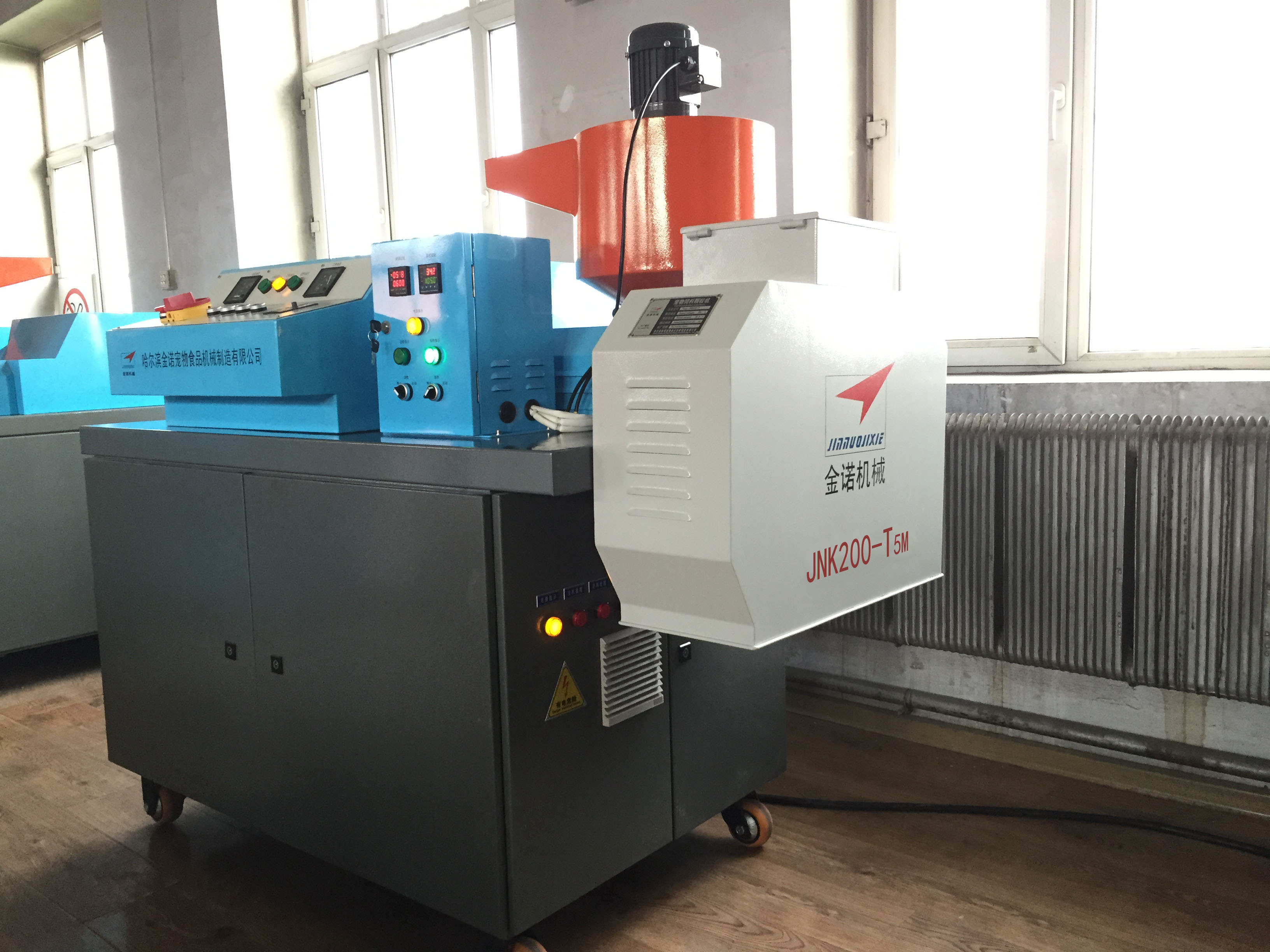 狗糧加工設備JNK200-T5M:1。JNK200-T5M型狗糧加工設備安裝方便、出廠已經試機,狗糧機切刀采用直角切刀技術,調試簡單;2。狗糧設備的主軸和切刀小軸均可隨時注入耐高溫潤滑脂,延長狗糧機的軸承使用壽命;3。JNK200-T5M狗糧設備每小時生產狗糧顆粒200公斤。
